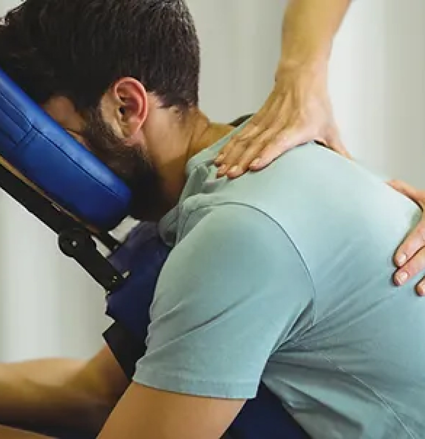 El masaje en silla, o On-Site Massage, está indicado para personas con poco tiempo o con limitaciones para tumbarse. Utiliza técnicas de quiromasaje clásico y acupresión, combinando estiramientos, compresión y fricciones para aliviar la tensión muscular en los hombros y espalda.